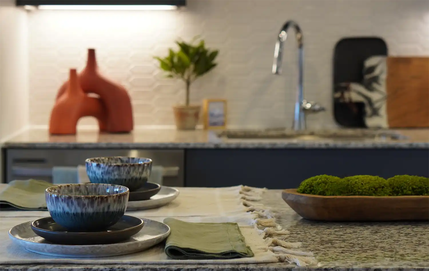 Ceramic tableware, soft textiles, and artful accents help the kitchen feel lived-in, creating a setting that naturally supports both cooking and conversation.
