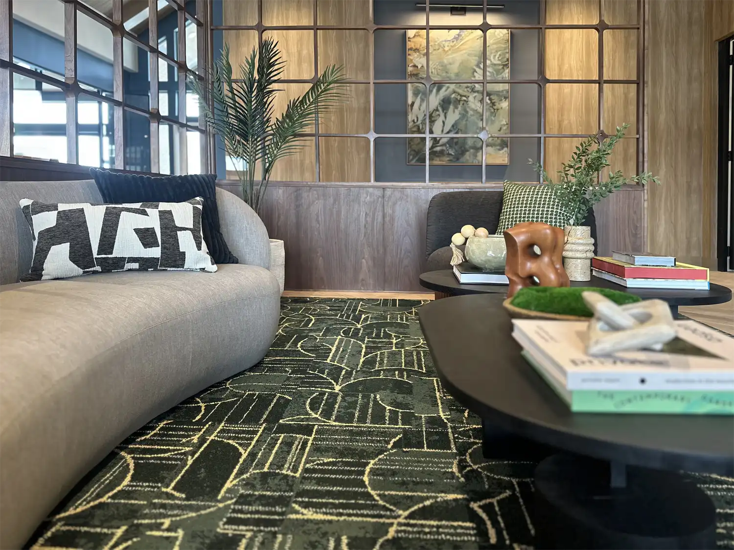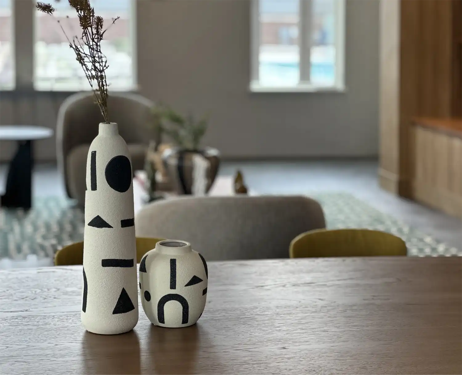 Graphic ceramic vessels bring contrast and texture to the tabletop, complementing the relaxed seating and layered materials nearby.