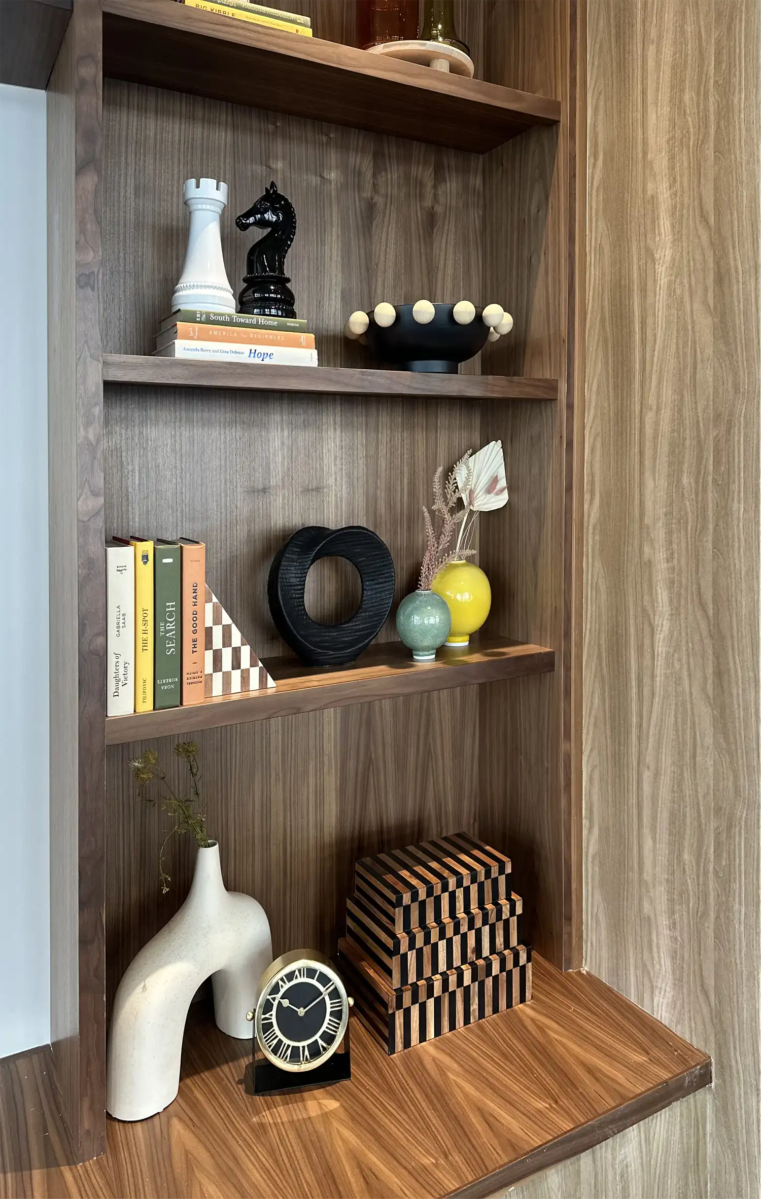 Books, ceramics, and sculptural accents turn the built-in shelving into a warm, layered focal point.