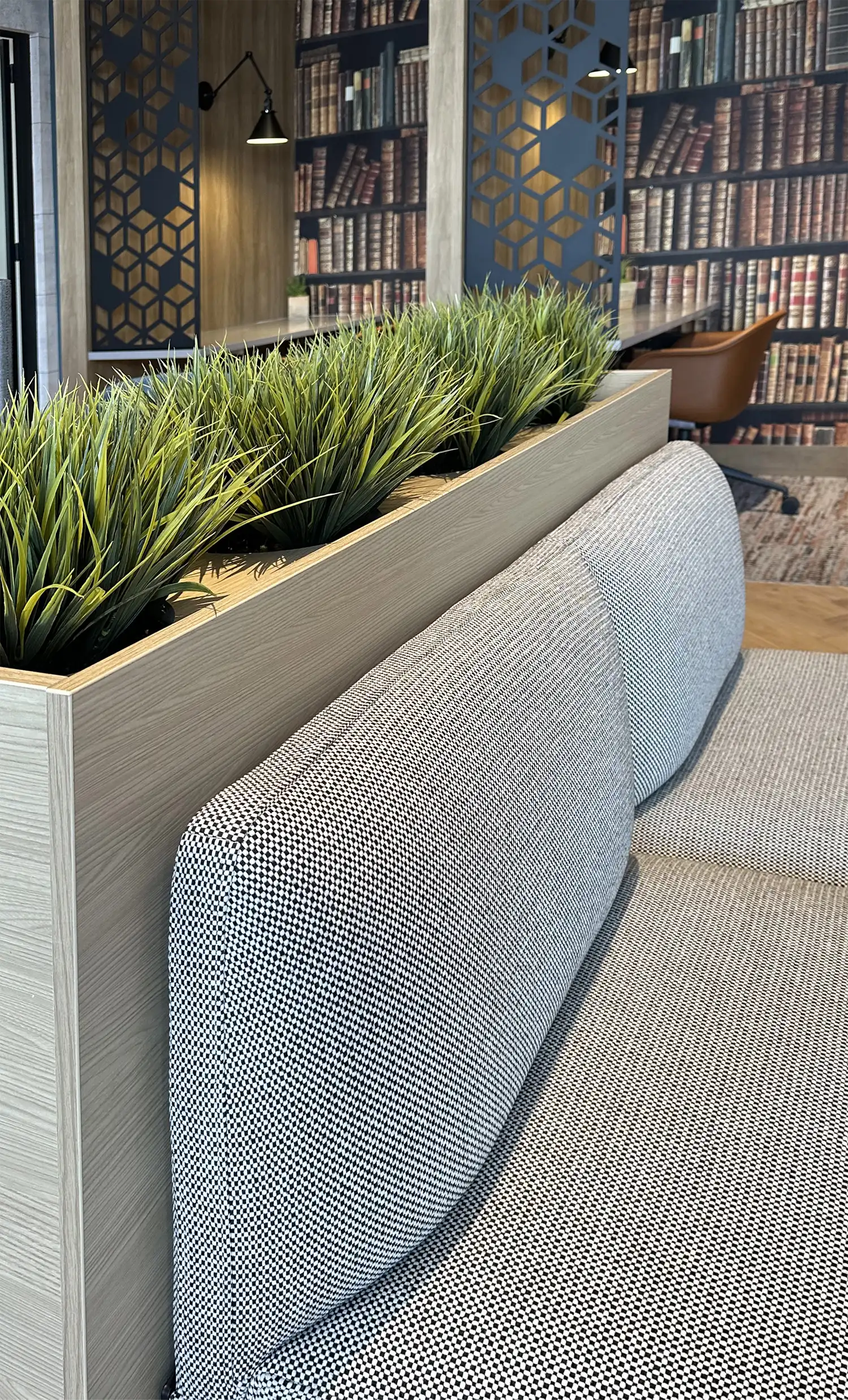 Planters and tailored seating work together to create a defined zone that balances openness with a sense of privacy.