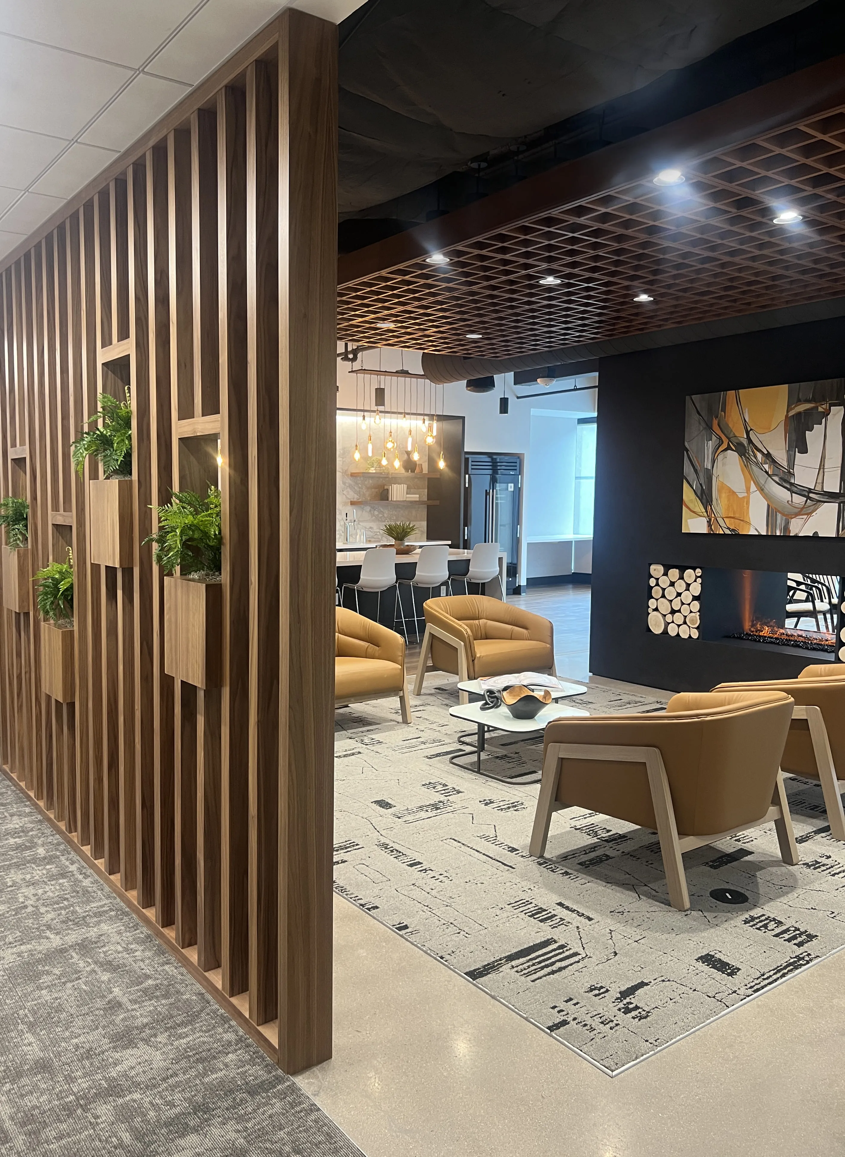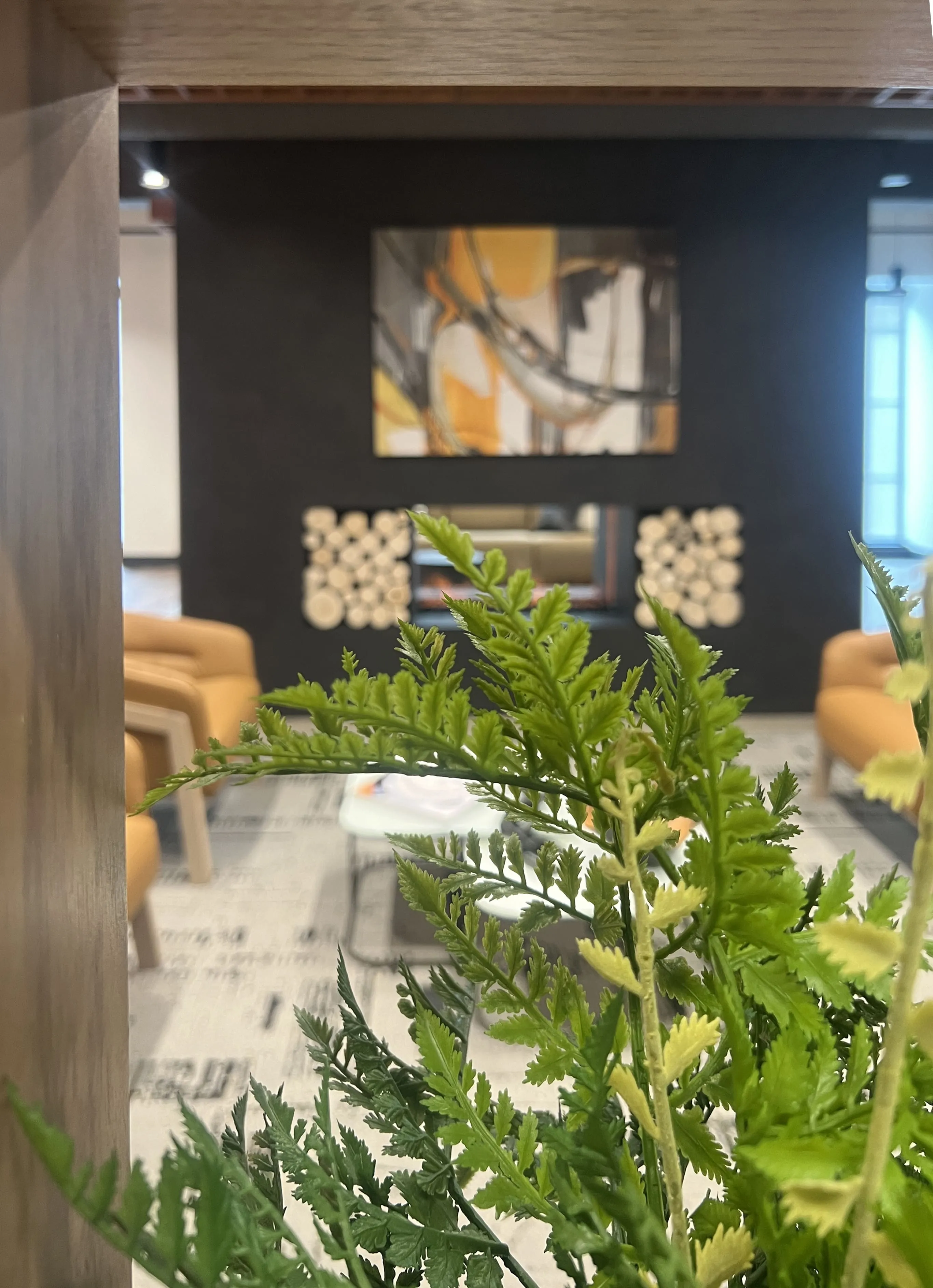 Layered greenery, texture, and art create moments that unfold as you move through the space, adding depth and calm beyond.