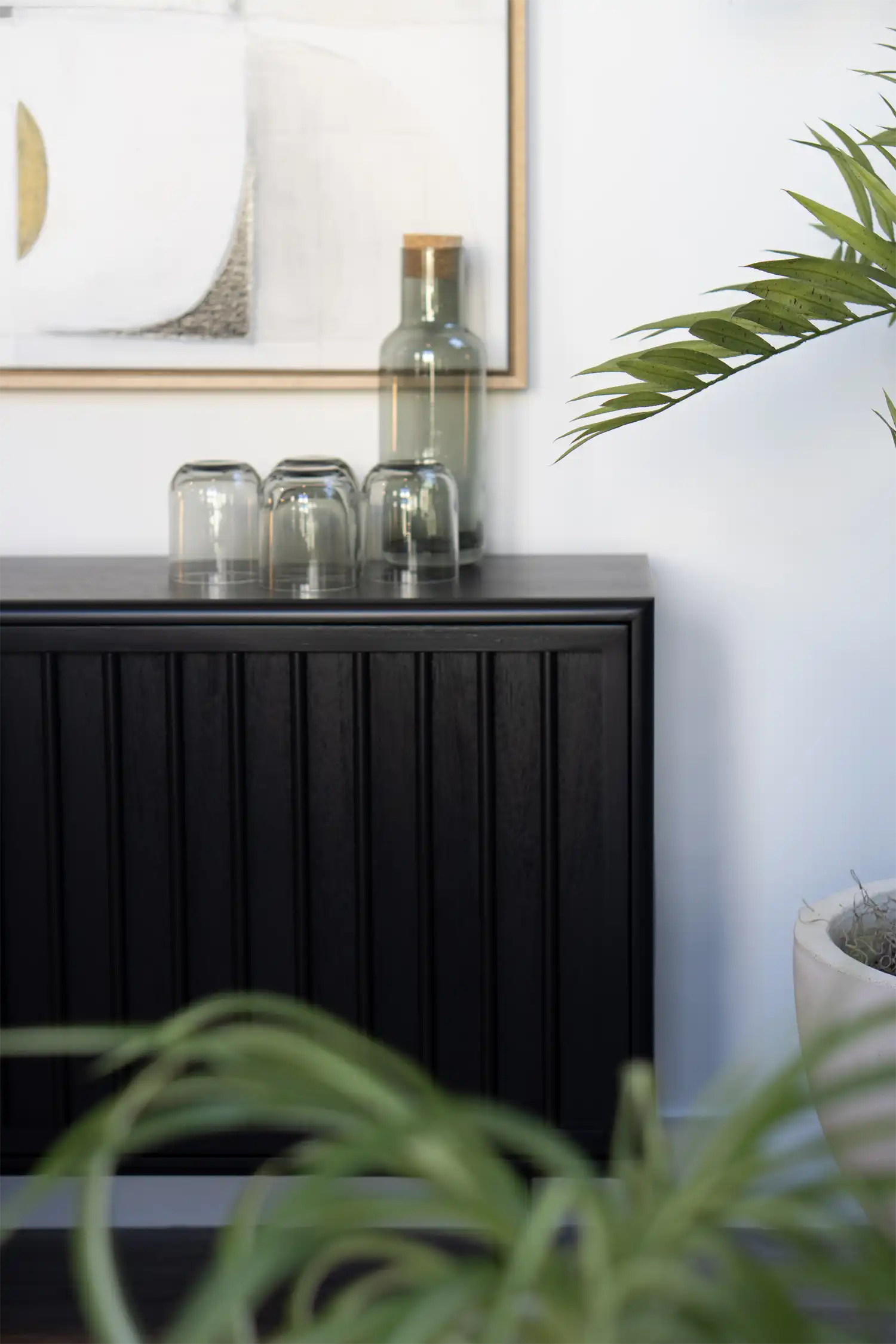 Simple barware styling and layered glass bring a quiet sense of intention to the vignette.