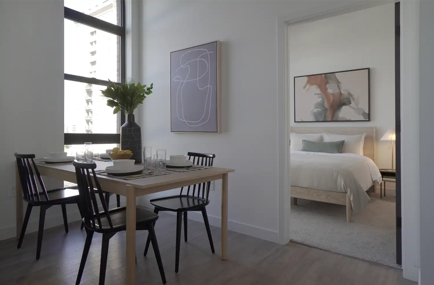 Inspired by rich patterns and grounded finishes, we layered in art, décor, bedding, and kitchen accents that make the model units feel instantly livable. From amenity lounge shelving to corridor and leasing-lobby art, local artist pieces add tangible sophistication with a rooted sense of place.